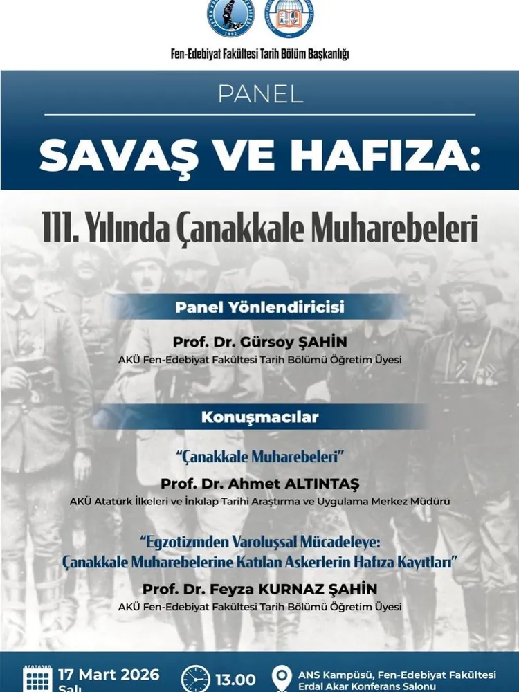 Afyon Kocatepe Üniversitesi'nde, Çanakkale Muharebeleri'nin 111. yıl dönümü münasebetiyle anlamlı bir panel düzenleniyor. "Savaş ve Hafıza: 111. Yılında Çanakkale Muharebeleri" başlıklı etkinlik, 17 Mart 2026 Salı günü saat 13:00'te üniversitenin Erdal Akar Konferans Salonu'nda akademisyenler, öğrenciler ve tarih severlerle buluşacak.
