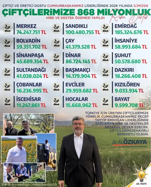 AK Parti Afyonkarahisar Milletvekili Ali Özkaya, Cumhurbaşkanı Recep Tayyip Erdoğan liderliğinde çiftçilere yönelik desteklerin sürdüğünü açıkladı.