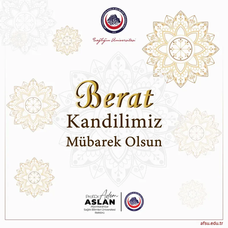 Afyonkarahisar Sağlık Bilimleri Üniversitesi (AFSÜ), resmi sosyal medya hesabı üzerinden Berat Kandili dolayısıyla bir mesaj yayımladı. Paylaşımda, "Berat Kandilimiz Mübarek olsun" ifadelerine yer verildi.