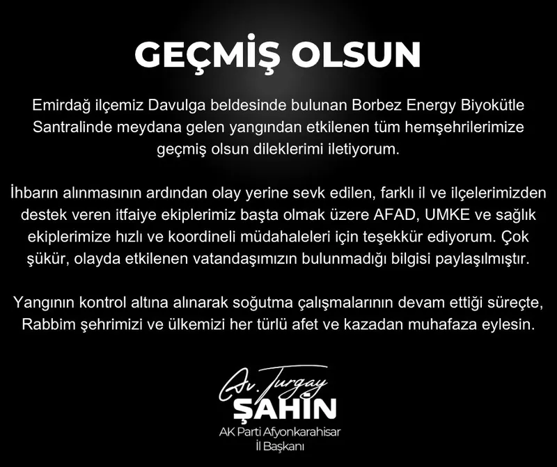 Ak Parti Afyonkarahisar İl Başkanı Turgay Şahin, yangından etkilenen tüm hemşehrilerine geçmiş olsun dileklerini iletti. Şahin, yaptığı açıklamada, ihbar üzerine olay yerine sevk edilen ve farklı il ile ilçelerden destek veren itfaiye ekipleri, AFAD, UMKE ve sağlık ekiplerine teşekkür etti. Şahin, "Hızlı ve koordineli müdahaleleri için teşekkür ediyorum. Çok şükür olayda etkilenen vatandaşımızın bulunmadığı bilgisi paylaşılmıştır" ifadelerini kullandı.