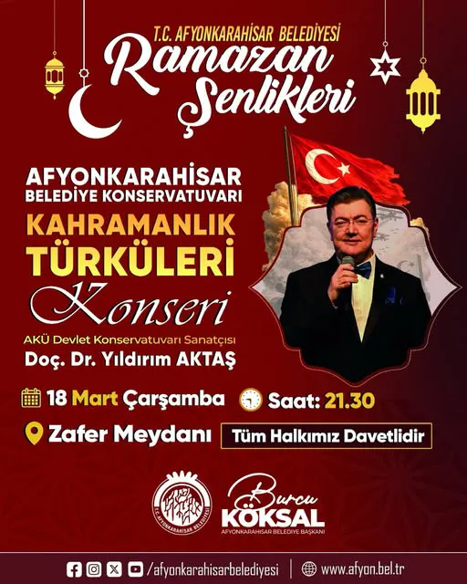 Afyonkarahisar Belediyesi, Ramazan Şenlikleri çerçevesinde anlamlı bir etkinliğe imza atmaya hazırlanıyor. 18 Mart Çarşamba günü saat 21:30'da Zafer Meydanı'nda düzenlenecek olan Kahramanlık Türküleri Konseri, Çanakkale ruhunu yeniden hatırlatacak.