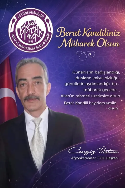 Afyonkarahisar Esnaf ve Sanatkarlar Odası Başkanı Cengiz Üstün, Berat Kandili dolayısıyla bir mesaj yayımladı. Üstün, bu mübarek gecenin tüm esnaf camiası ve millet için hayırlara vesile olmasını diledi.