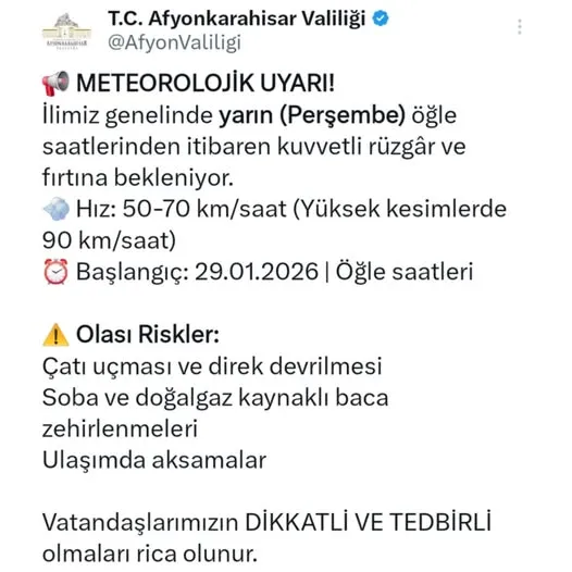 Afyonkarahisar Valiliği'nden yapılan açıklamaya göre, il genelinde yarın (29 Ocak 2026 Perşembe) öğle saatlerinden itibaren kuvvetli rüzgar ve fırtınanın etkili olması bekleniyor.