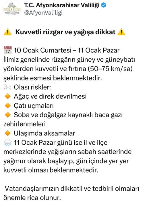 Bu kapsamda Afyonkarahisar Valiliği, vatandaşların dikkatli ve tedbirli olmalarını önemle rica etti.