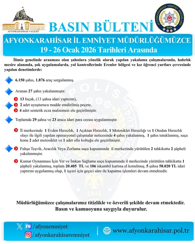 Operasyonun bir diğer ayağını ise kız öğrenci yurtları çevresinde yapılan denetimler oluşturdu. Bu çalışmalarla öğrencilerin güvenli bir çevrede eğitim hayatlarına devam etmeleri sağlanırken, olası suç unsurlarının bölgeden uzaklaştırılması hedeflendi. Afyonkarahisar İl Emniyet Müdürlüğü, benzer güvenlik operasyonlarının gelecek dönemde de devam edeceğini açıkladı.
