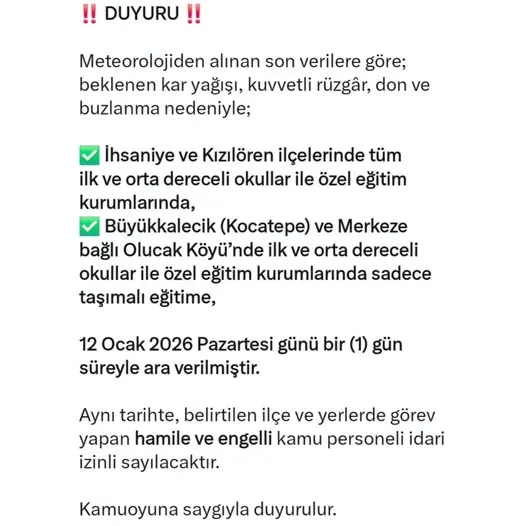 Afyonkarahisar Valiliği, meteorolojiden alınan tahminler doğrultusunda beklenen yoğun kar yağışı, kuvvetli rüzgar, don ve buzlanma tehlikesi nedeniyle 12 Ocak 2026 Pazartesi günü bazı ilçe ve köylerde eğitim öğretime bir gün süreyle ara verildiğini duyurdu.