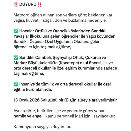 İhsaniye ilçesinde ise tüm ilk ve orta dereceli okullar ile özel eğitim kurumlarında 13 Ocak 2026 Salı günü eğitim öğretim faaliyetleri yapılmayacak.