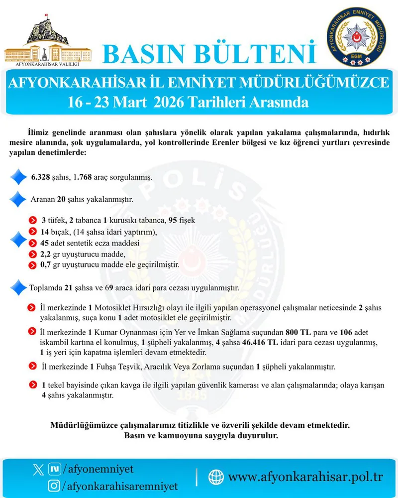 Afyonkarahisar İl Emniyet Müdürlüğü, operasyonla aranması olan şahısların yakalanması için gerekli tüm adımları attı. Detaylı planlama ve uygulama, operasyonun başarılı bir şekilde gerçekleştirilmesini sağladı.