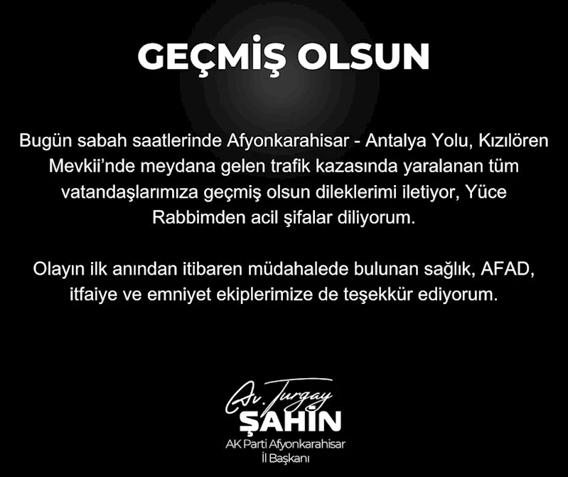 AK Parti Afyonkarahisar İl Başkanı Turgay Şahin yaptığı açıklamada, “Bugün sabah saatlerinde Afyonkarahisar Antalya Yolu Kızılören Mevkii’nde meydana gelen trafik kazasında yaralanan tüm vatandaşlarımıza geçmiş olsun dileklerimi iletiyor, Yüce Rabbimden acil şifalar diliyorum” ifadelerini kullandı. Olayın ilk anından itibaren sağlık ekipleri ve AFAD’ın bölgeye intikal ederek müdahalede bulunduğunu vurguladı.