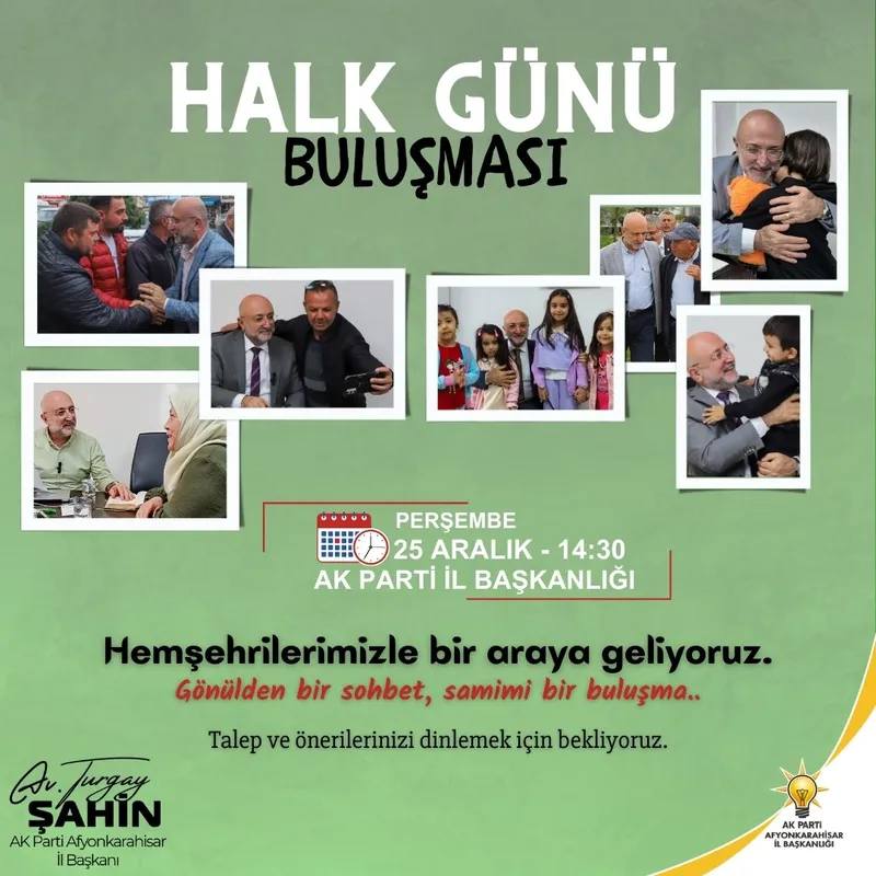 Ak Parti Afyonkarahisar İl Başkanı Turgay Şahin, hemşehrileriyle bir araya geleceği bir halk buluşması düzenliyor. 25 Aralık Perşembe günü gerçekleşecek etkinlikte, vatandaşların talep ve önerilerini dinlemek amaçlanıyor.