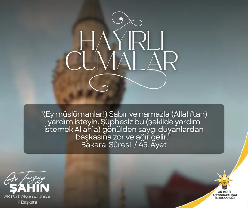 AK Parti Afyonkarahisar İl Başkanı Turgay Şahin, Cuma günü yayınlanan bir mesajla vatandaşlara seslendi. Mesajında dini bir içerik paylaşan Şahin, Bakara Suresi'nin 45. ayetini hatırlatarak müminlere sabır ve namazla Allah'tan yardım dilemelerini öğütledi.