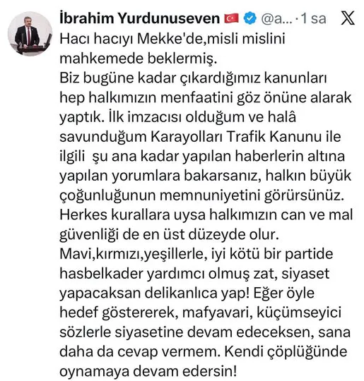 Yurdunuseven, konuşmasına çarpıcı bir atasözü ile başladı. "Hacı hacıyı Mekke de misli mislini mahkemede beklermiş" diyerek, yaptıkları işlerin hesabını vermekten çekinmediklerini ima etti. Vekil, bu sözle siyasi eleştirilere ve yargı süreçlerine atıfta bulundu.