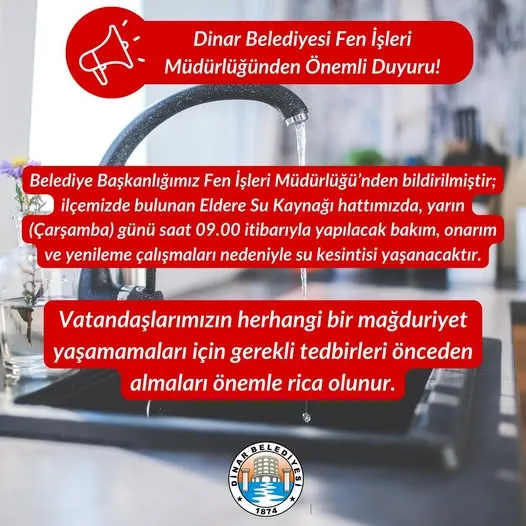 Dinar Belediyesi, Eldere Su Kaynağı hattında yapacakları bakım ve yenileme çalışmaları nedeniyle yarın su kesintisine gidileceğini duyurdu. Vatandaşların mağdur olmamaları için tedbir almaları istendi.