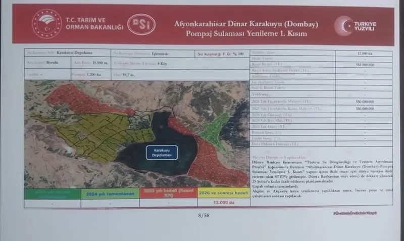 Afyonkarahisar’ın Dinar ilçesinde bulunan Dombay Ovası'ndaki tarımsal üretimi canlandıracak önemli bir proje için ihale tarihi netleşti. Karakuyu Dombay Pompaj Sulaması Yenileme Projesi'nin dış kredili yapım işi ihalesinin Şubat 2026'da gerçekleştirileceği açıklandı.