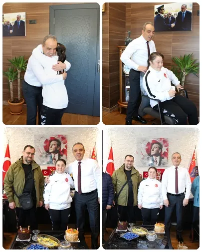 Down sendromlu milli sporcu Münevvere Yılmaz ve antrenörü Oğuz Özavar'ın doğum günü, Afyonkarahisar İl Emniyet Müdürü Ahmet Birtan Erol'un ev sahipliğinde kutlandı. Bu özel günde Yılmaz'a, hayalini kurduğu çalışma koltuğu hediye edildi.