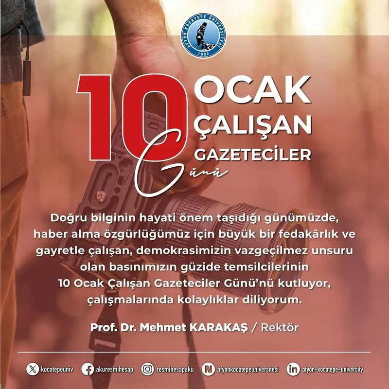 Prof. Dr. Karakaş, tüm çalışan gazetecilerin 10 Ocak Çalışan Gazeteciler Günü'nü kutlayarak, mesleklerini icra ederken her zaman hakikatin ve kamu yararının peşinden gitmeleri temennisinde bulundu. Afyon Kocatepe Üniversitesi Rektörü'nün tam mesaj metni, üniversitenin resmi haber portalından okunabilir.
