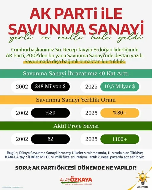 Türkiye'nin savunma sanayisi alanında son yıllarda kaydettiği olağanüstü gelişme, rakamlara yansıdı. AK Parti Afyonkarahisar Milletvekili Ali Özkaya, savunma sanayindeki dönüşüme dikkat çekerek, 2002 yılı ile 2025 yılı hedefleri arasındaki çarpıcı farkı paylaştı. Paylaşılan veriler, sektörün ihracatında 40 katı aşkın bir artış yaşandığını gözler önüne seriyor.