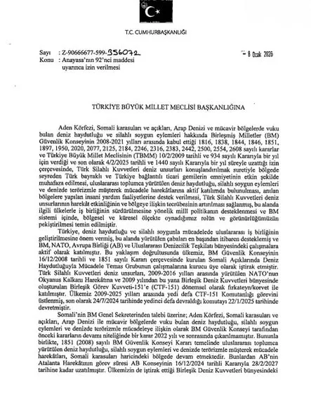 Türkiye Büyük Millet Meclisi, Aden Körfezi, Somali Açıkları, Arap Denizi ve mücavir bölgelerde görev yapan Türk Silahlı Kuvvetleri Deniz unsurlarının görev süresinin 1 yıl daha uzatılmasını öngören Cumhurbaşkanlığı tezkeresini onayladı.